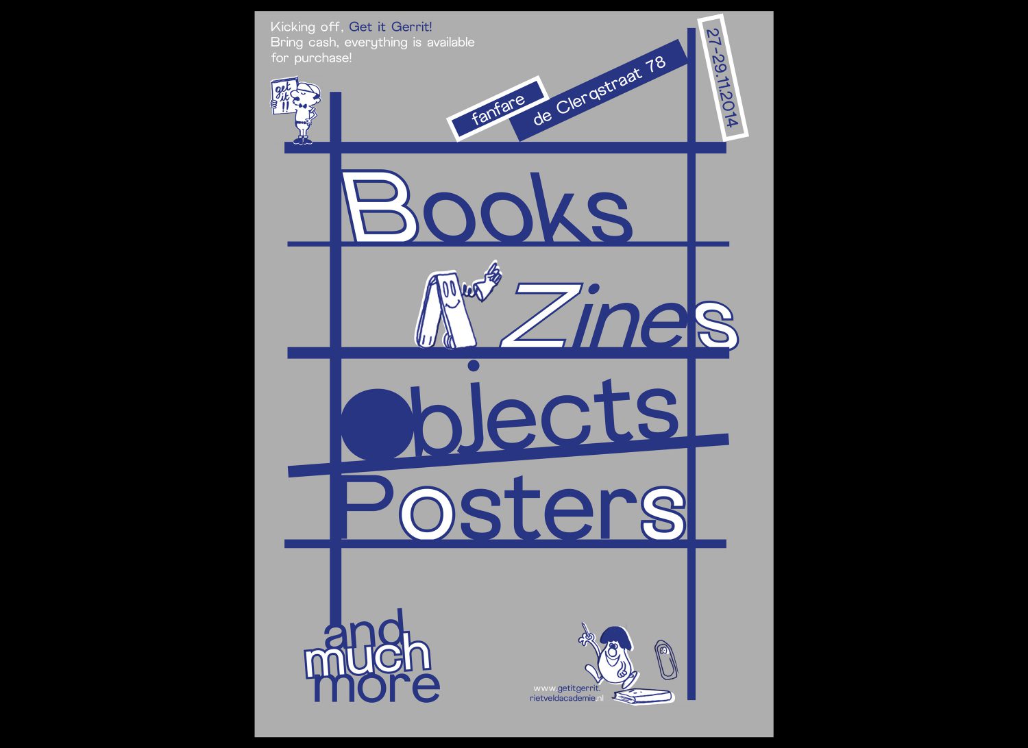 Get it Gerrit, Was an initiative taken back in 2014/15 with Ott Metusala, Andrada Smaranda, Lou Buche, Luca Carboni at the Gerrit Rietveld Academie to develop a public platform where we will be exhibiting, archiving and selling some of the schoolwork created by current and past students. As most of the time they would end up in a box somewhere in the house of the students themselves, the intention is to take these wonderful posters, booklets, objects and t-shirts and give them a chance to be viewed by a wider audience. This unique collection will be for sale during our events. The display furniture was build on spot with material we found in the spaces. Get it Gerrit took place in Amsterdam and Paris.